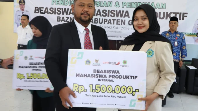 Bupati Gresik Fandi Akhmad Yani secara simbolis menyalurkan Beasiswa Pendidikan Badan Amil Zakat Nasional (Baznas) kepada mahasiswa kurang mampu saat membuka kegiatan Pendistribusian dan Pembinaan Beasiswa Mahasiswa Produktif (BMP) Baznas Gresik Tahun 2025, Rabu (17/12/2025).