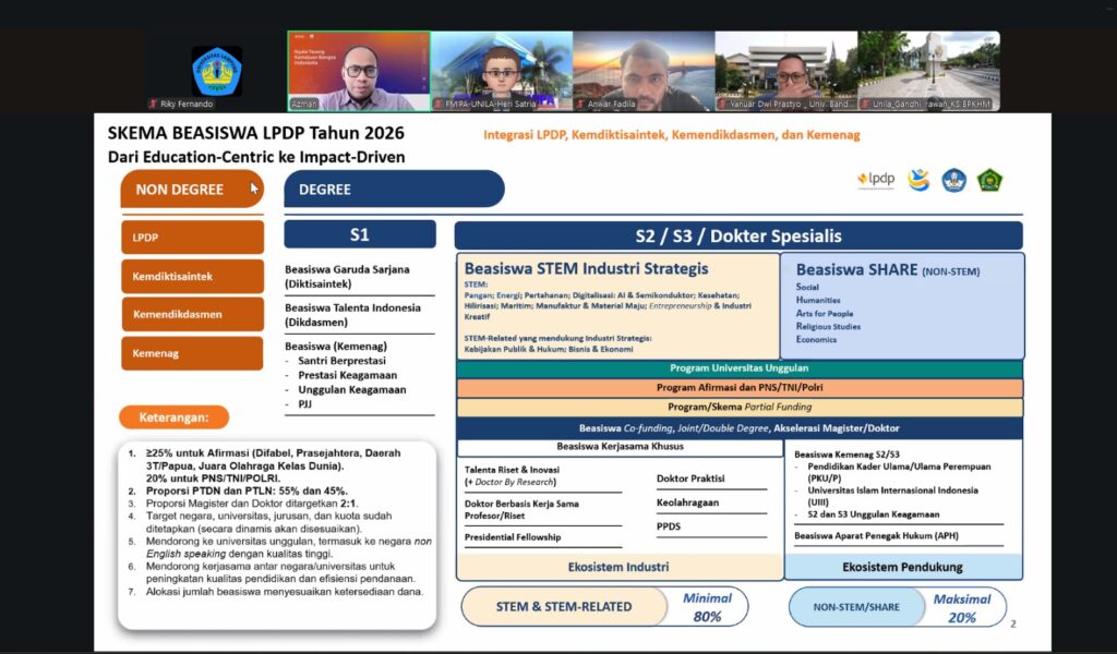 Universitas Lampung (Unila) membuka peluang lebih luas bagi sivitas akademika untuk mengakses beasiswa dan jejaring pendidikan global melalui Sosialisasi Program Beasiswa Lembaga Pengelola Dana Pendidikan (LPDP) 2026 secara daring, Kamis 23 April 2026.