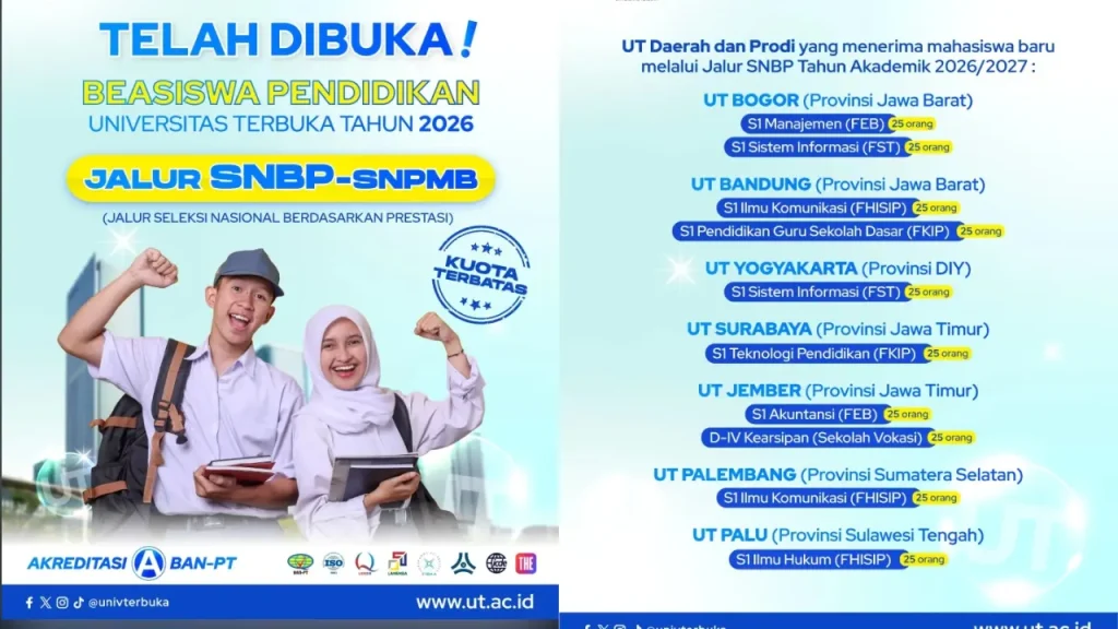 Universitas Terbuka (UT) membuka pendaftaran beasiswa kuliah gratis bagi mahasiswa baru melalui jalur Seleksi Nasional Berdasarkan Prestasi (SNBP) 2026. Program ini berupa pembebasan biaya studi selama delapan semester bagi siswa yang lolos seleksi pada program studi yang telah ditetapkan.